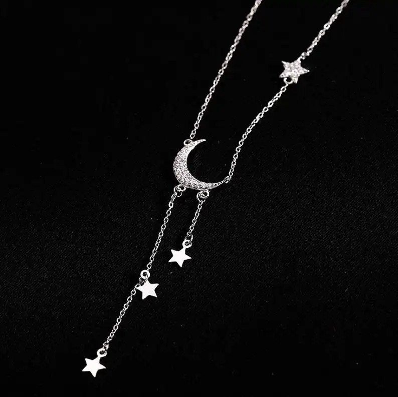 Pandantivul în formă de lună este realizat cu atenție la detalii din argint de înaltă calitate. Luna este încrustată cu cristale strălucitoare, care conferă un efect subtil de scânteiere și strălucire. Sub luna principală, atârnă delicat mai multe steluțe mici din argint, care completează designul cu un aspect jucăuș și fermecător.