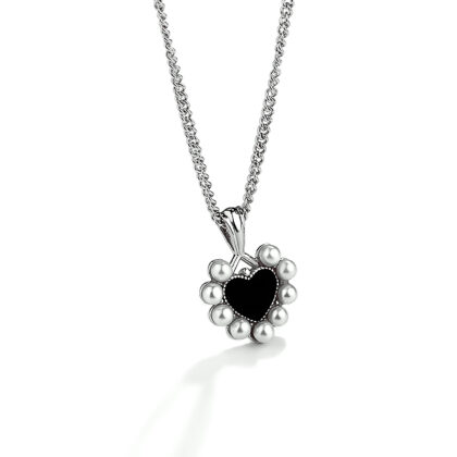 Colierul argint 925 pandantiv inimioara este o bijuterie elegantă și sofisticată. Pandantivul are forma unei inimi de culoare neagră, o nuanță care adaugă un element misterios și sofisticat bijuteriei. Forma inimii simbolizează iubirea și afecțiunea. În jurul acesteia sunt dispuse perle sintetice albe care adaugă un contrast bijuteriei.