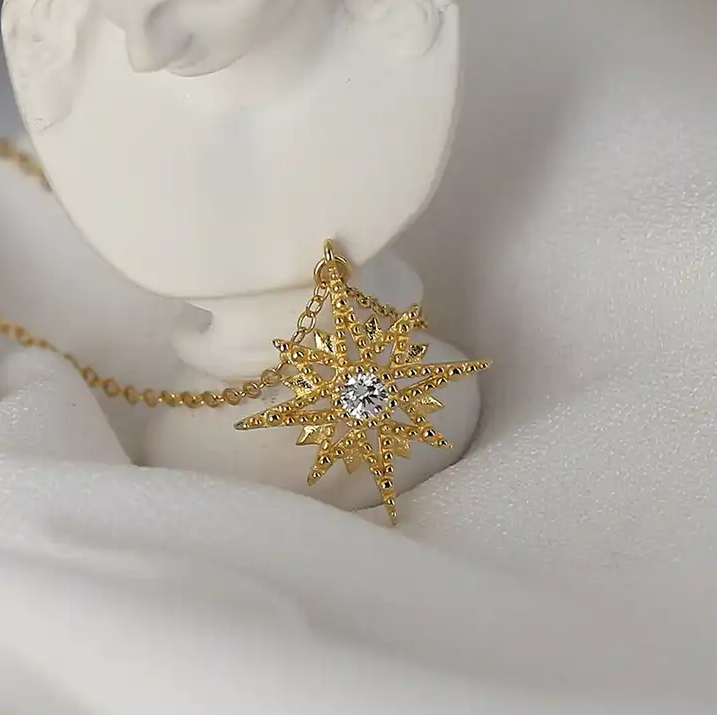 Colierul argint 925 placata aur steluta calauzitoare o bijuterie fascinantă și plină de eleganță, care atrage privirile și emană o strălucire subtilă. Steluța delicată, plasată în centrul colierului, adaugă o notă de mister și romantism, amintind de farmecul nopții înstelate și al universului vast.