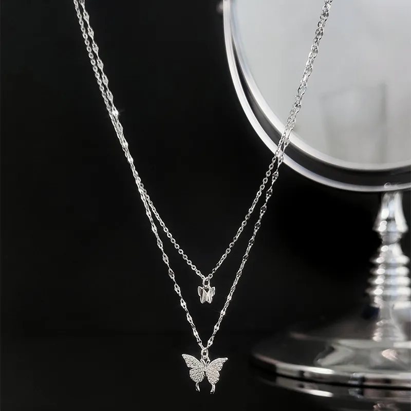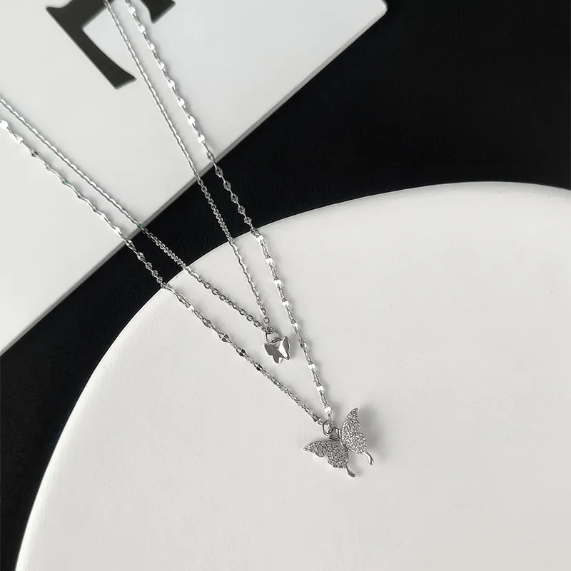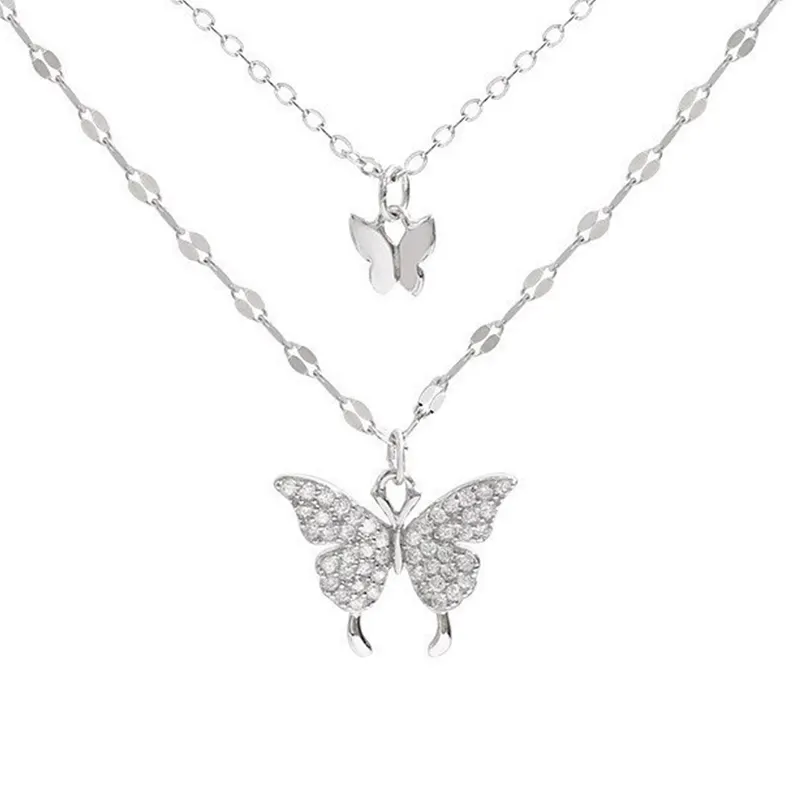 Lanțul principal, mai lung, este realizat din argint și este detaliat cu măiestrie pentru a se potrivi perfect cu pandantivul fluture mare. Acest pandantiv în formă de fluture este decorat cu cristale strălucitoare, care adaugă un strop de strălucire și farmec, conferindu-i un aspect elegant.