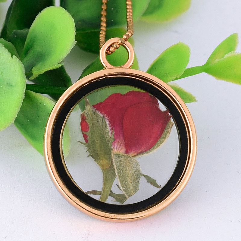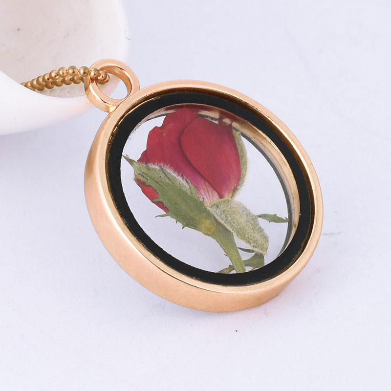 Pandantivul de sticlă este lucrat manual, ceea ce conferă bijuteriei un aspect artistic și un farmec distinct. Acest colier are un design simplu și delicat, care se completează perfect cu naturalețea trandafirului uscat.