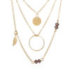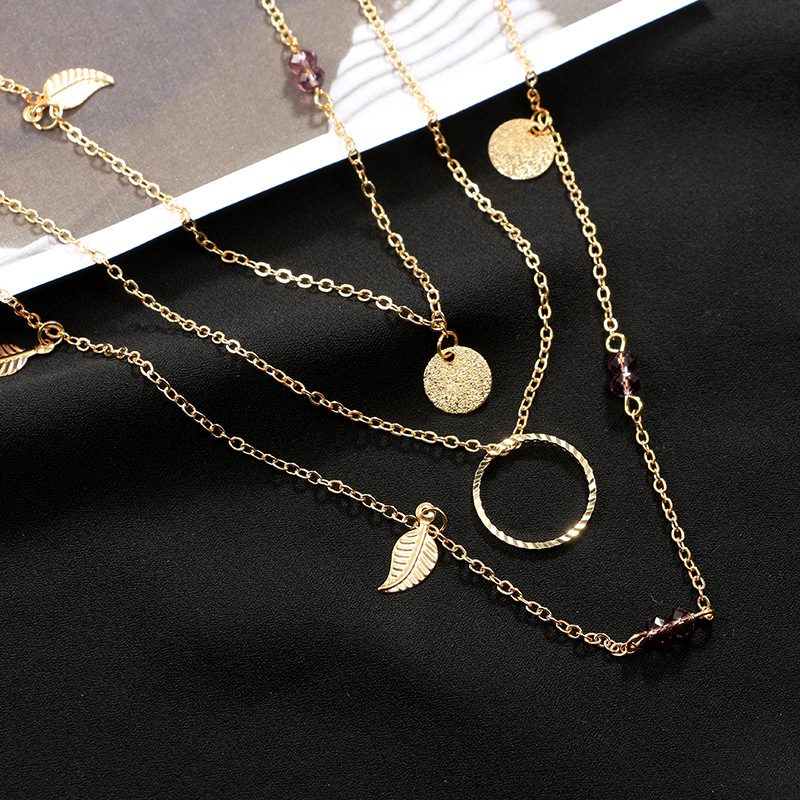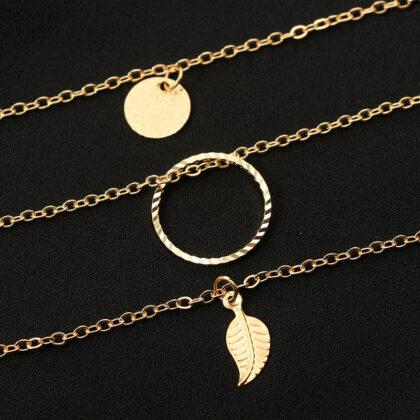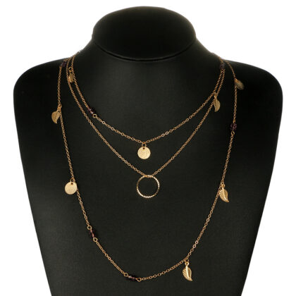 Colierul are mai multe straturi, fiecare cu propriul său lanț și pandantiv sau mărgea. Această structură în straturi adaugă textură și profunzime bijuteriei, oferindu-i un aspect elegant și bogat.