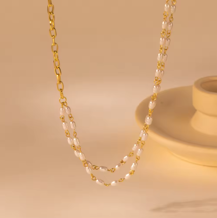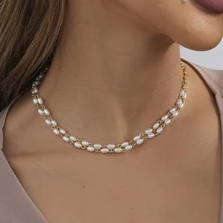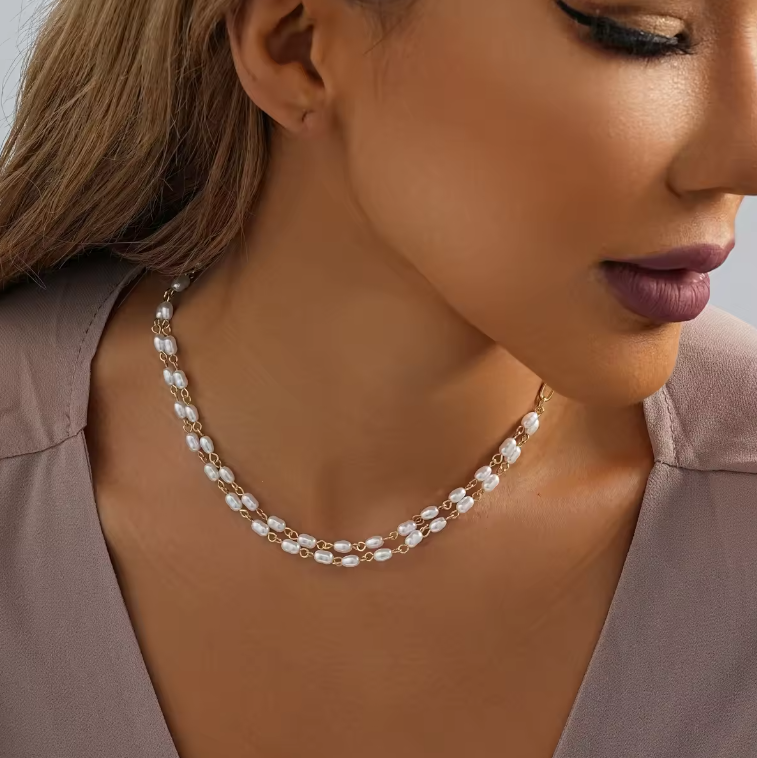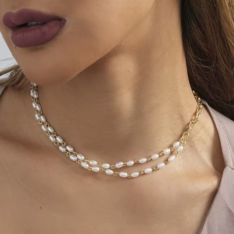 Colierul perlute double layers este elegant și rafinat, compus din două rânduri de perle mici, de formă neregulată, legate între ele cu ajutorul unor mici inele aurii. Perlele sunt albe, iar distanța dintre ele este uniformă, ceea ce contribuie la un aspect armonios. Lanțul aurit adaugă un contrast subtil și elegant, evidențiind delicatețea perlelor.
