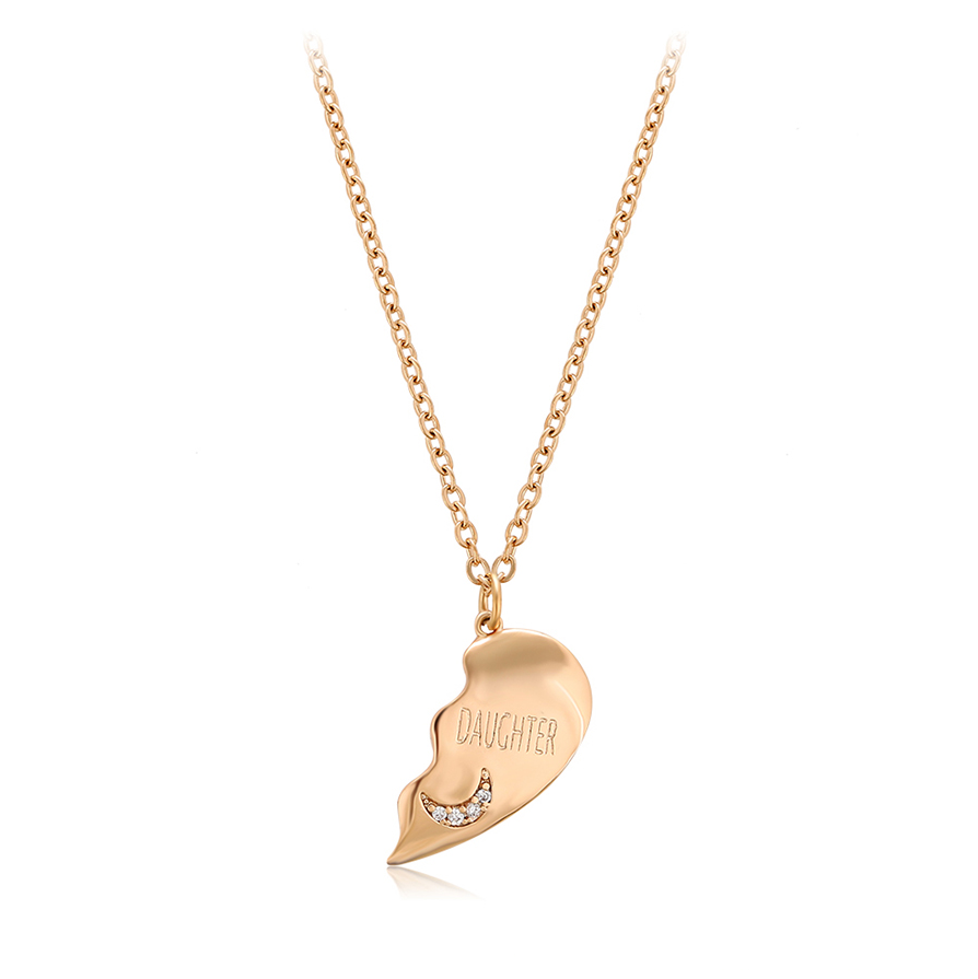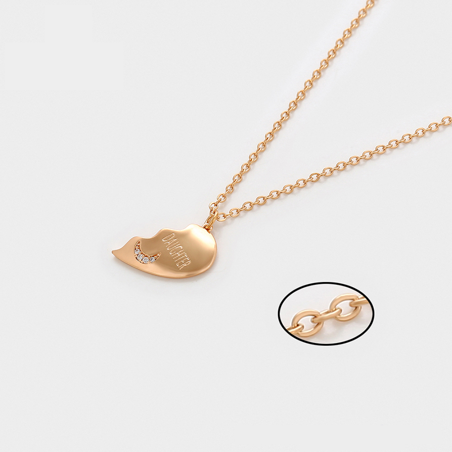 Colierul placat aur roze Daughter este accesorizat cu un pandantiv special în formă de jumătate de inimă, inscripționat cu cuvântul „Daughter”. Cu un design delicat și plin de semnificație, acest colier simbolizează dragostea profundă și legătura unică dintre o mamă și fiica ei.