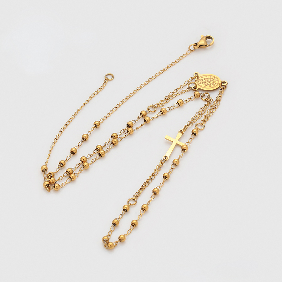Colierul religios placat cu aur tip rozariu îmbină tradiția și eleganța într-un design remarcabil. Inspirat de forma și structura unui rozariu tradițional, acest colier captivant adaugă o notă distinctă de rafinament și stil oricărei ținute.
