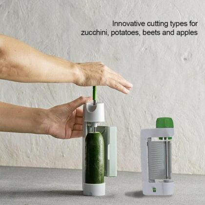 Dispozitiv pentru feliatul in spirala al fructelor si legumelor, usor de utilizat si spalat, culoare alb/verde.