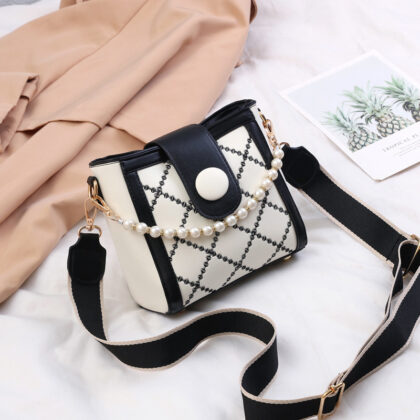 Această geantă albă cu detalii negre este un accesoriu de lux care iese în evidență. Detaliile de contrast dintre alb și negru, împreună cu mânerul elegant din perle, o fac potrivită pentru evenimente speciale sau pentru a adăuga o notă de eleganță la ținutele de zi cu zi. Cu o astfel de geantă, veți atrage cu siguranță atenția și veți străluci în orice ocazie. Este un accesoriu care îmbină funcționalitatea cu stilul și vă ajută să vă mențineți organizate lucrurile esențiale în timp ce arătați impecabil.