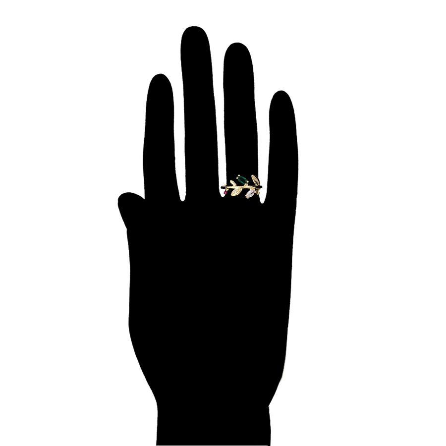 Forma frunzuliței și detaliile cristalelor oferă inelului o notă de sofisticare, iar aurul plătit adaugă o strălucire suplimentară, reflectând eleganța și rafinamentul. Acest inel este ideal pentru a completa o ținută elegantă sau pentru a adăuga un accent strălucitor și distinct în orice ocazie specială.