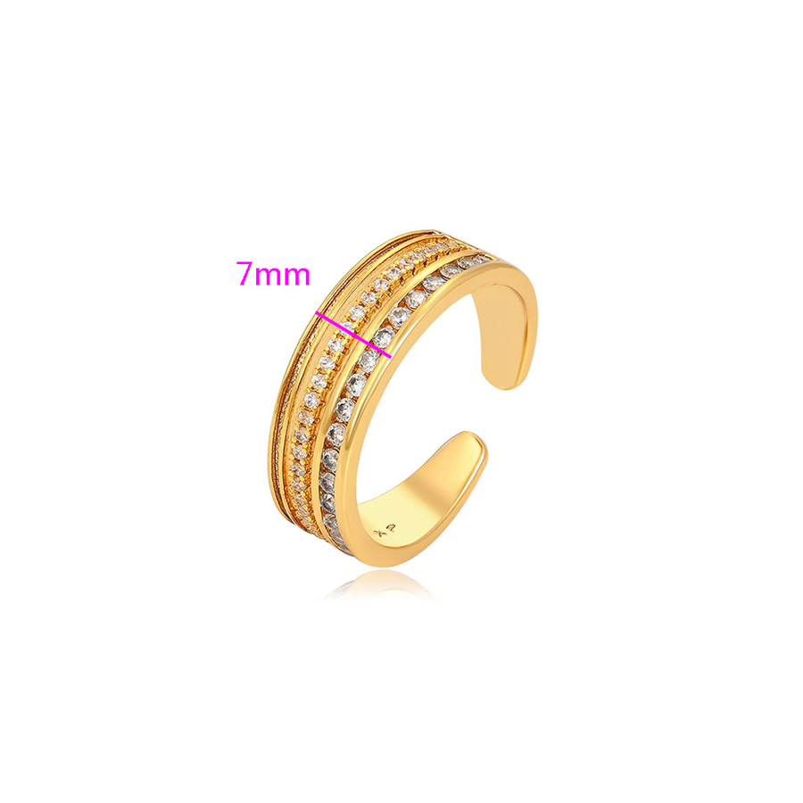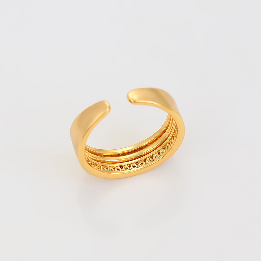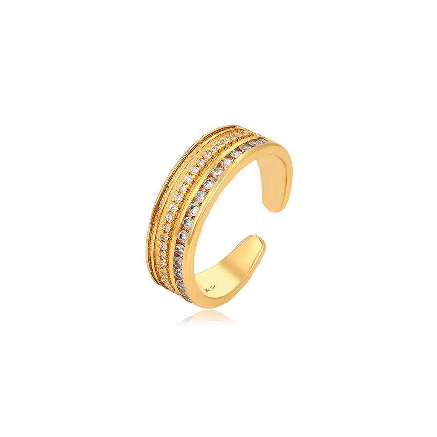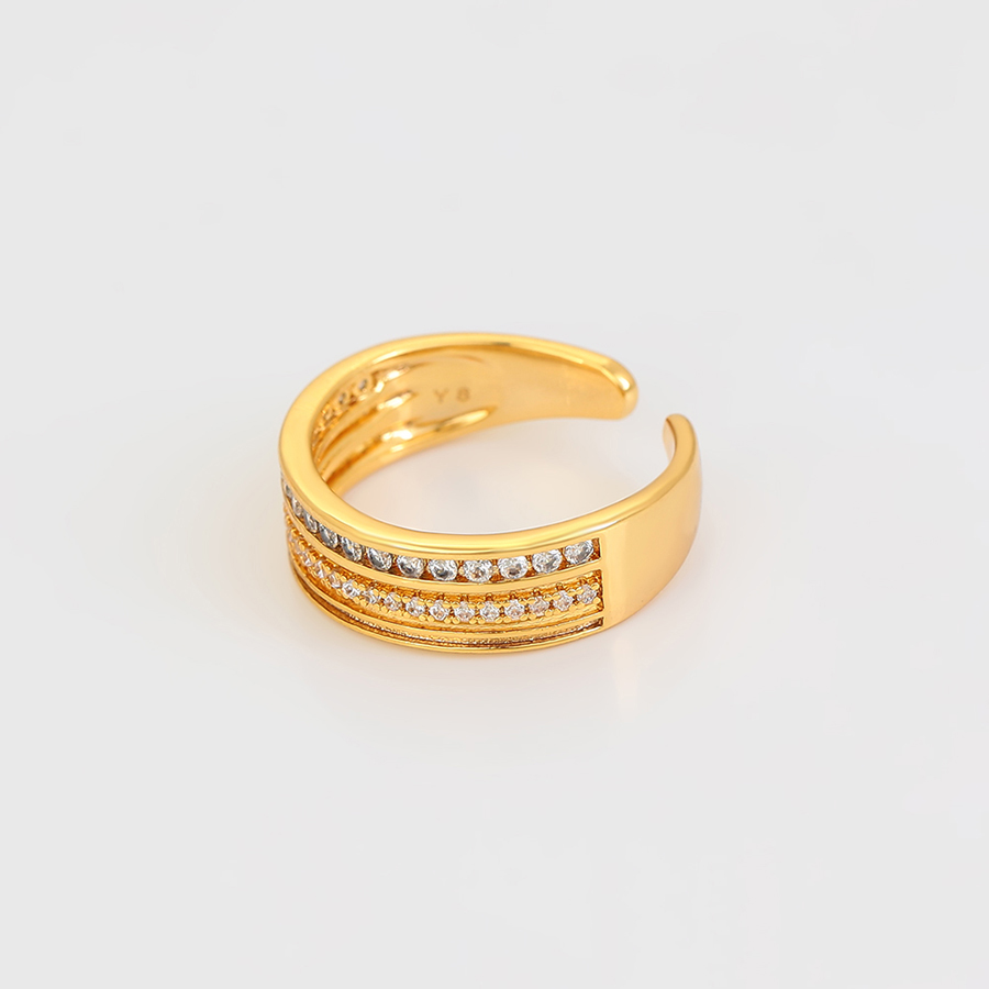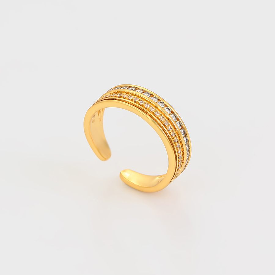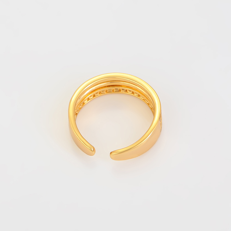 Inelul placat aur lat cu cristale este o bijuterie excepțională ce emană eleganță și rafinament. Cu un design captivant, inelul îmbină armonios elemente clasice și contemporane, creând astfel o piesă deosebită care atrage atenția.