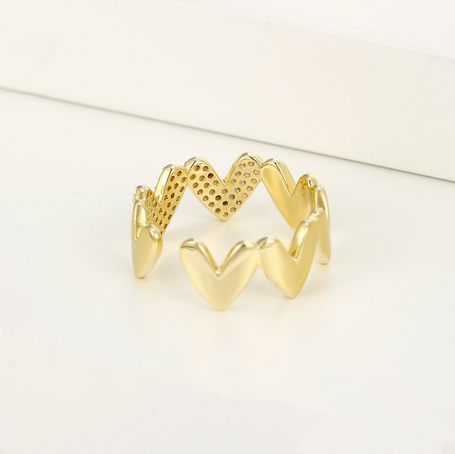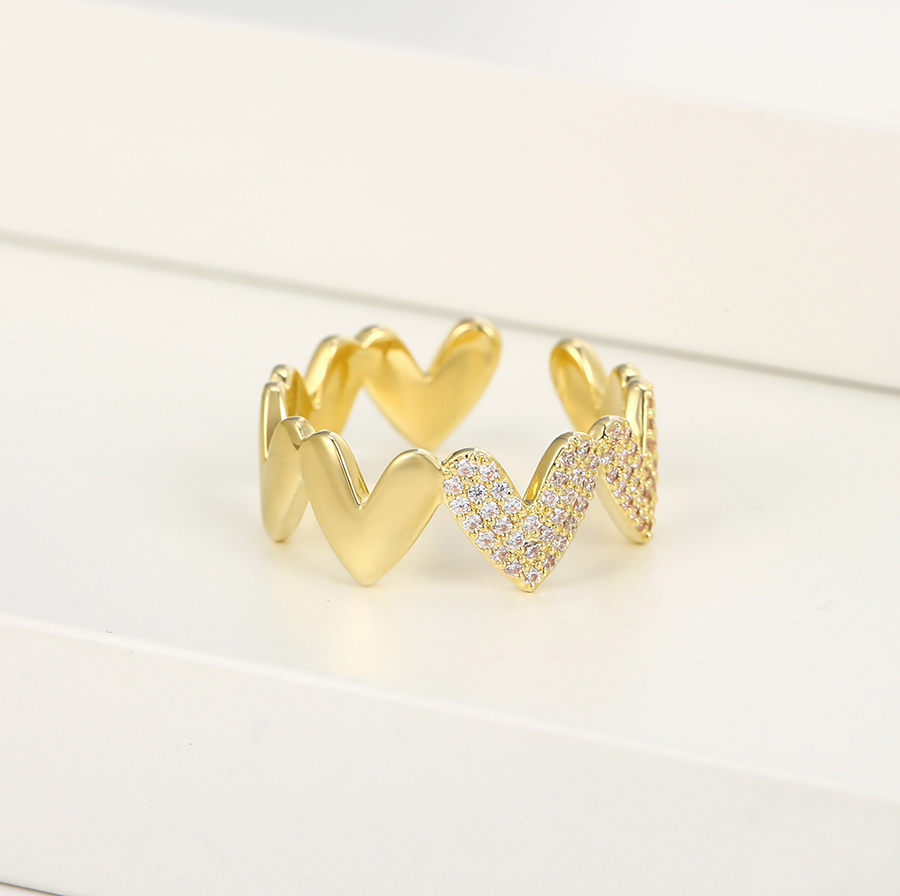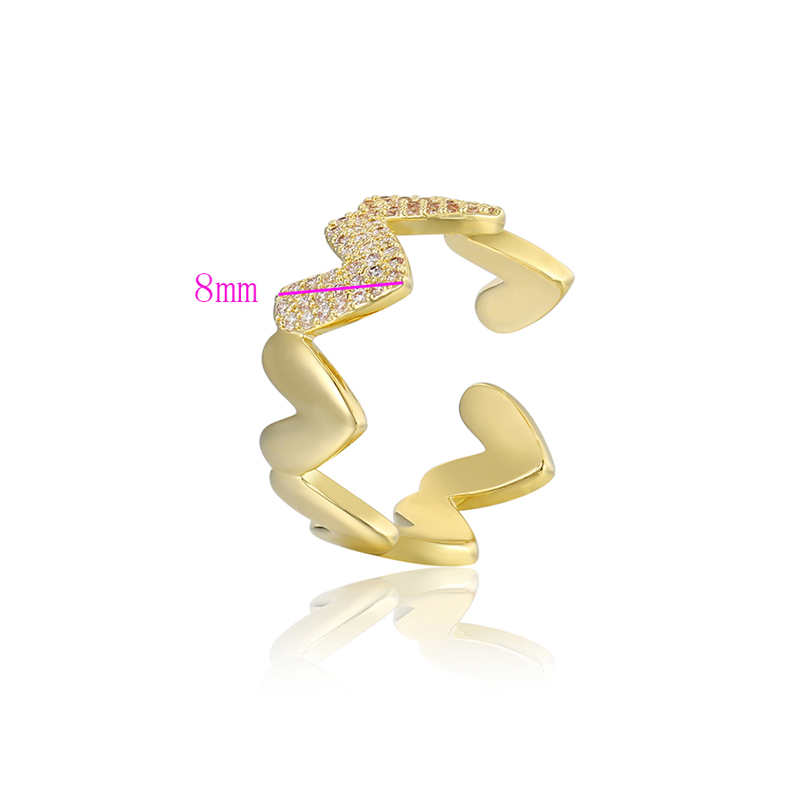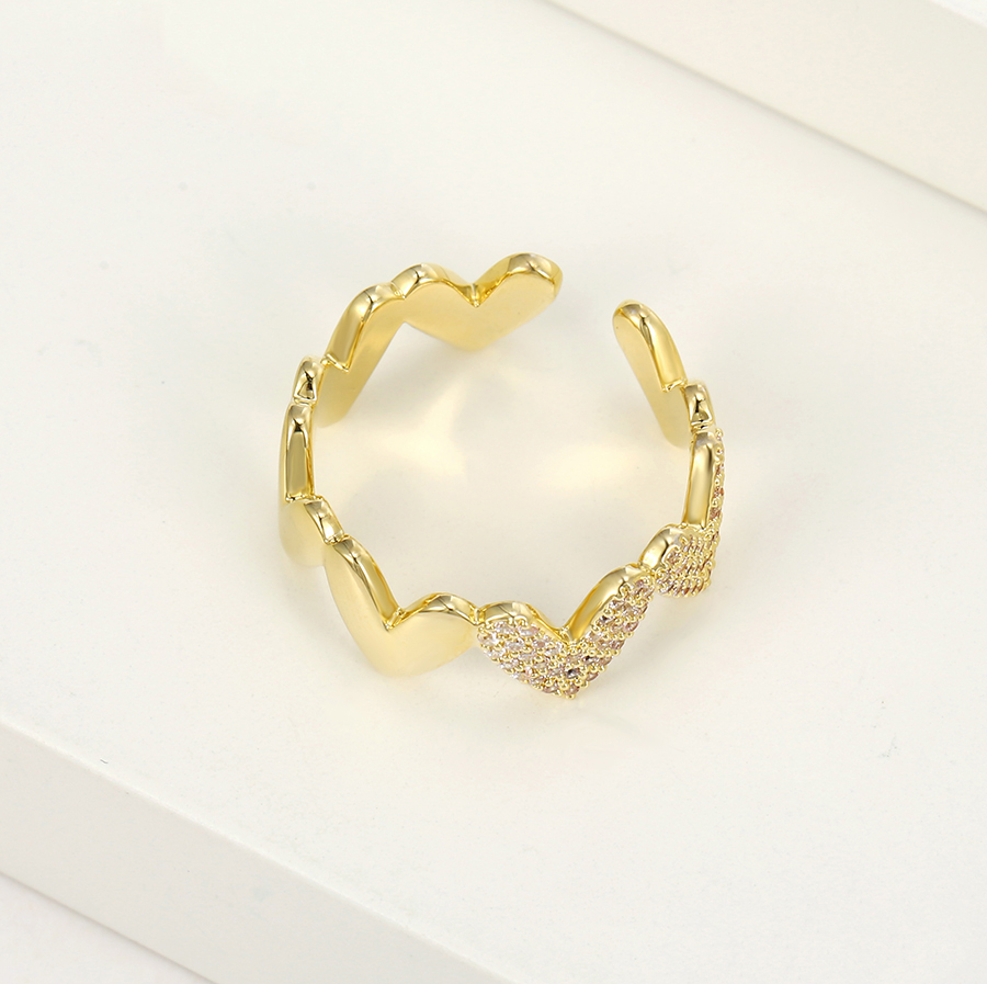 Aliajul placat cu aur conferă inelului un aspect luxos și strălucitor, imitând strălucirea aurului pur. Modelul în formă de inimioare sugerează un simbol al iubirii și romantismului, iar cristalele adaugă un element de eleganță și sclipire, făcând bijuteria potrivită pentru ocazii speciale sau purtare zilnică.