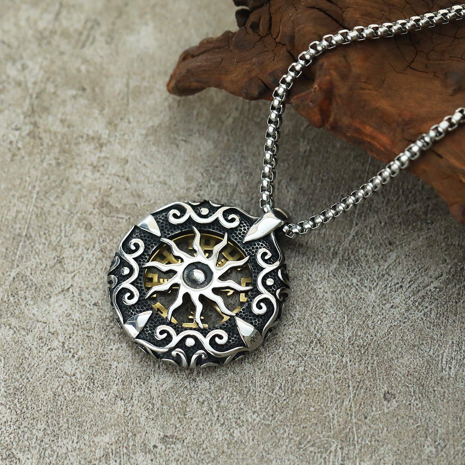 Lantul barbati pandantiv cruce este confecționat dintr-un amestec de metale, cu un detaliu central aurit. Modelul central are un simbol complex, asemănător cu rune sau motive tradiționale nordice, cunoscute și sub numele de simboluri vegvisir, un simbol al busolei vikinge. Acesta este înconjurat de un cadru decorativ cu forme fluide și curbate, realizat tot dintr-un material argintiu. Designul sugerează un amestec de simbolism nordic și estetică modernă, fiind probabil un accesoriu care are semnificații legate de protecție și ghidare, precum vegvisirul în cultura vikingă.