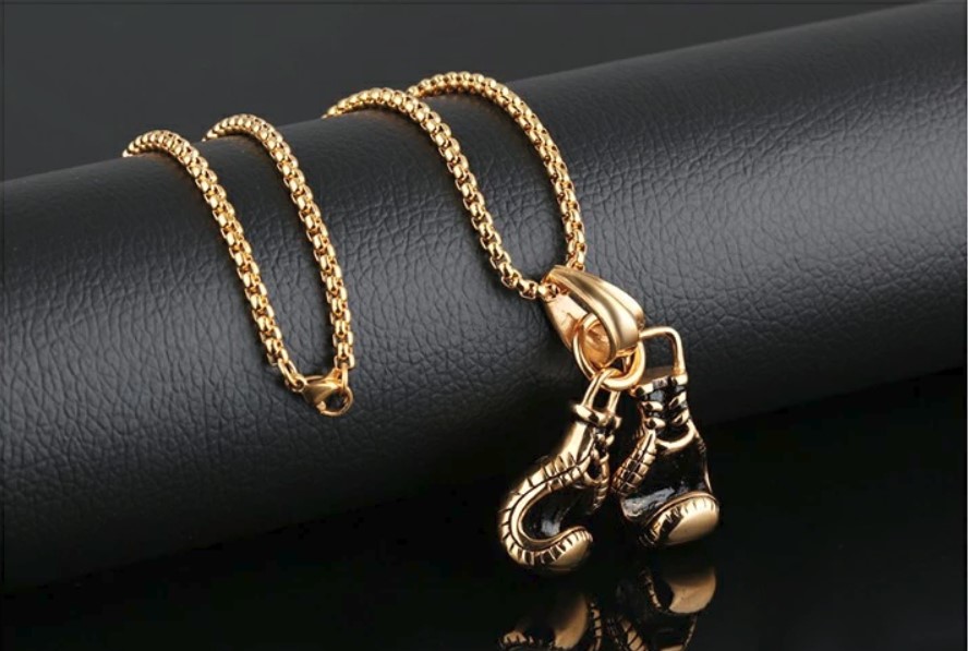 Lant cu pandantiv manusa de box placat cu aur este o bijuterie interesantă pentru cei pasionați de box sau pentru cei care doresc să exprime puterea și determinarea.