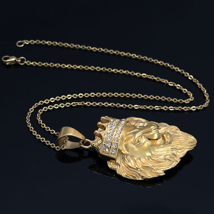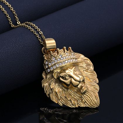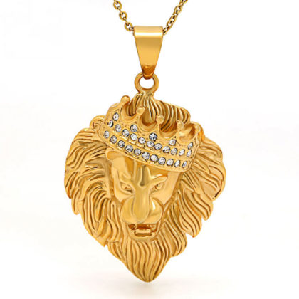 Lantul placat aur cu pandantiv regele animalelor purtând o coroană din cristale de zirconiu este o bijuterie elegantă și impunătoare. Acest produs este placat cu aur ceea ce ii oferă un aspect elegant și luxos