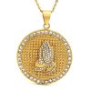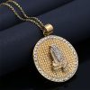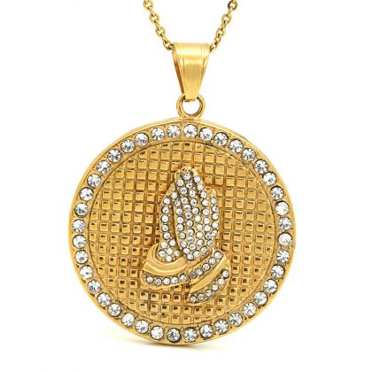 Punctul focal al acestui lant îl constituie pandantivul său impresionant. Pandantivul, de formă rotundă, găzduiește în centrul său două maini împreunate pentru rugăciune. Purtand acest lant este o modalitate minunată de a-ți exprima credința și spiritualitatea, precum și de a te conecta la valorile și tradițiile religioase care îți sunt dragi.