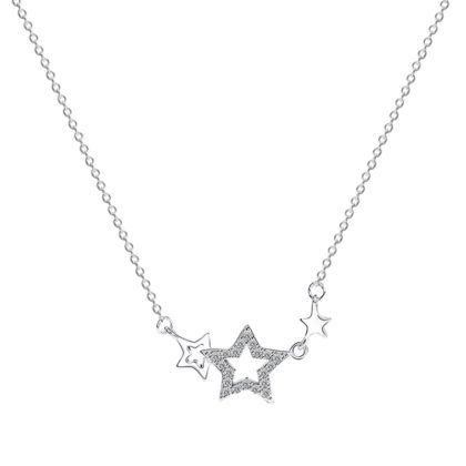 Pandantivul este alcătuit din trei steluțe delicate, dintre care cea din mijloc este punctul focal. Steluța centrală este încrustată cu cristale din zirconiu strălucitor, care emană sclipiri elegante și reflectă lumina într-un mod fermecător. Cele două steluțe alăturate completează designul într-un mod subtil și armonios.