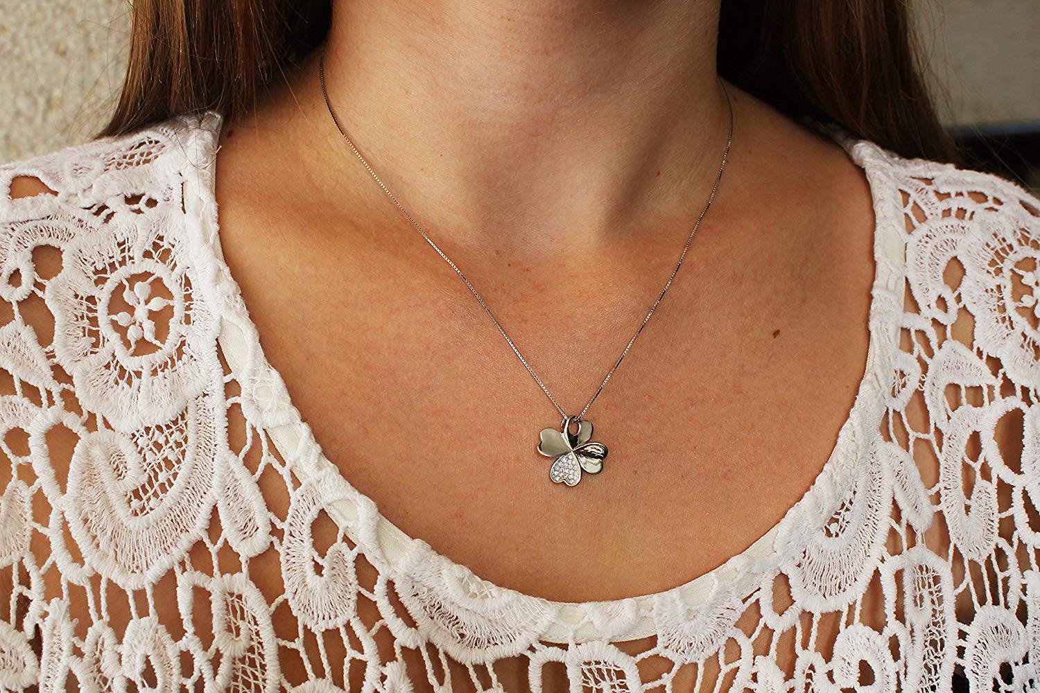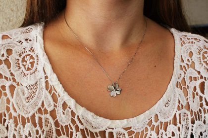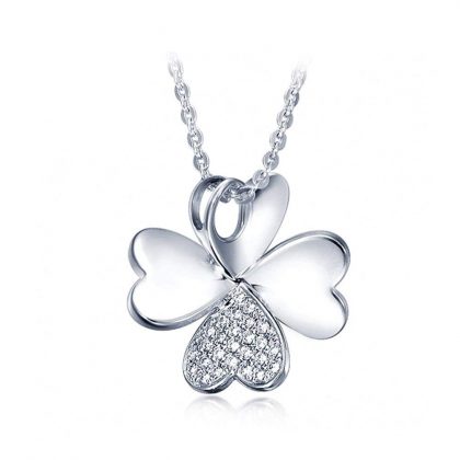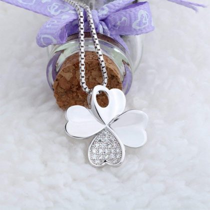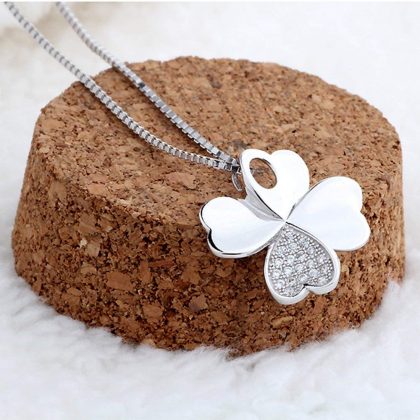 Lantisorul din argint 925 cu pandantiv trifoi si zirconiu este o bijuterie plină de semnificații speciale. Pandantivul reprezintă simbolul clasic al trifoiului cu patru foi, cunoscut și sub numele de trifoi cu noroc, care aduce cu sine promisiunea fericirii și a bunăstării. Pandantivul are o construcție fină, cu patru foi distincte, fiecare realizată cu atenție la detalii. Una dintre foile trifoiului strălucește în mod special, datorită pietrelor de zirconiu plasate cu grijă pe ea.