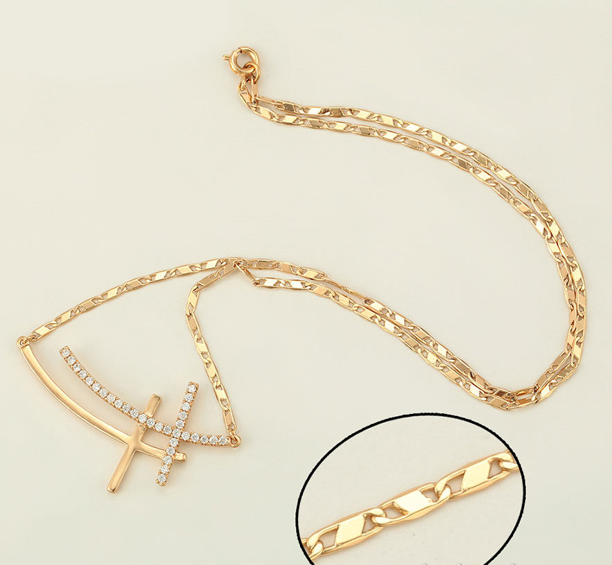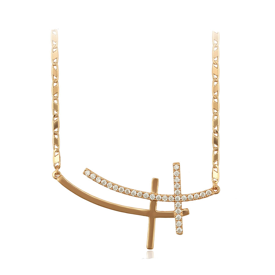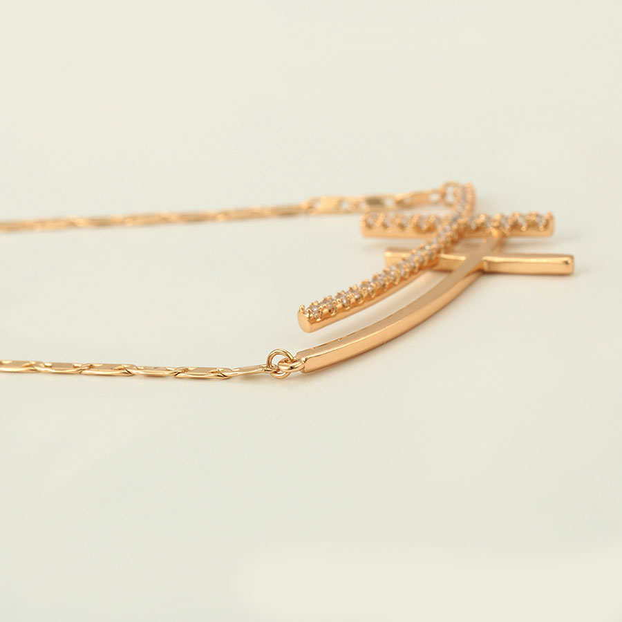 Lantisorul cruciulita dubla placat aur 18K adaugă o notă de eleganță și spiritualitate într-un mod rafinat. Acest accesoriu îmbină semnificația religioasă cu strălucirea subtilă a pietrelor de zirconiu, rezultând o bijuterie plină de însemnătate.