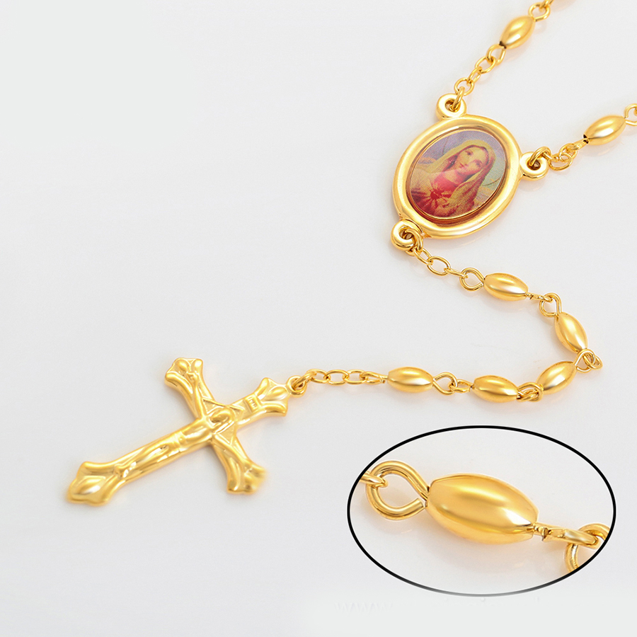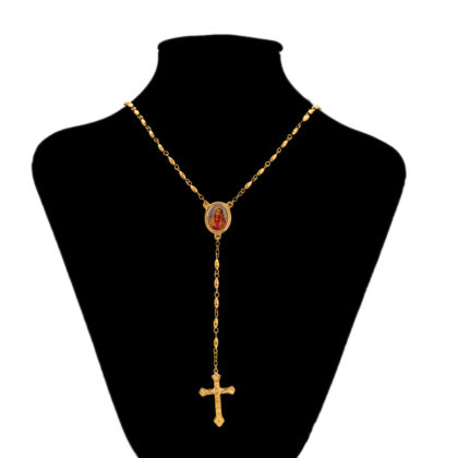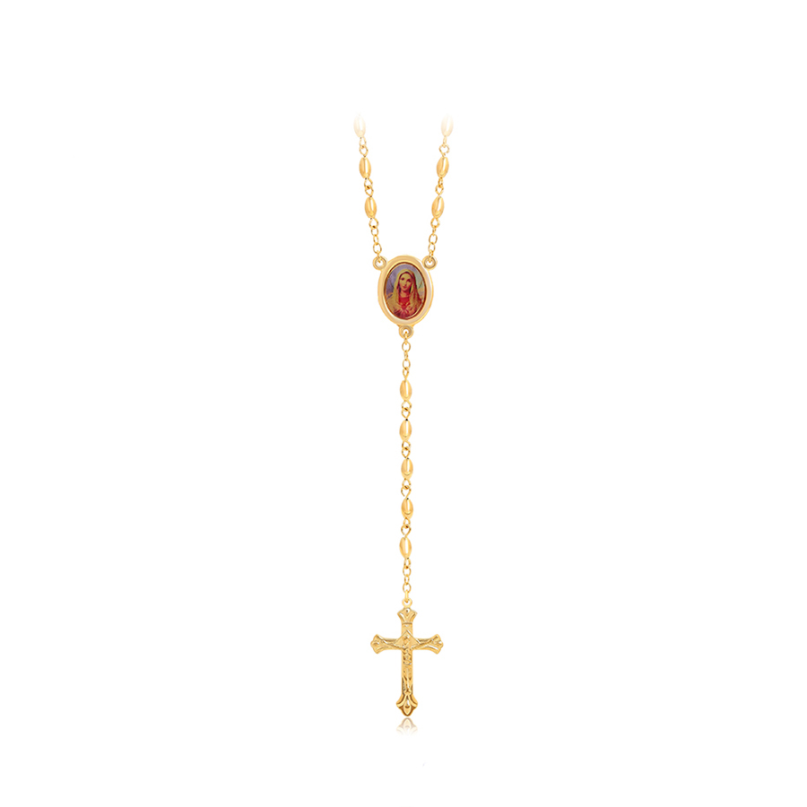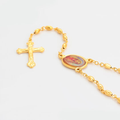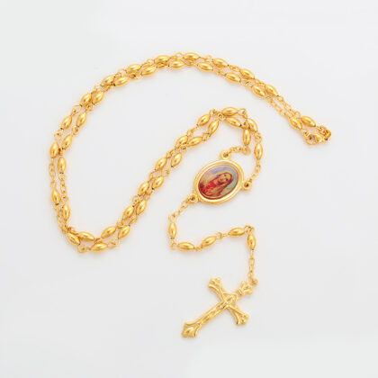 Rozariul placat aur 24K este o bijuterie elegantă și semnificativă, inspirată de tradiționalul rozariu religios. Este confecționat dintr-un aliaj metalic acoperit cu un strat subțire de aur pentru a-i conferi un aspect bogat și strălucitor. Rozariul este frumos ornamentat, avand detaliile finisate cu atenție.