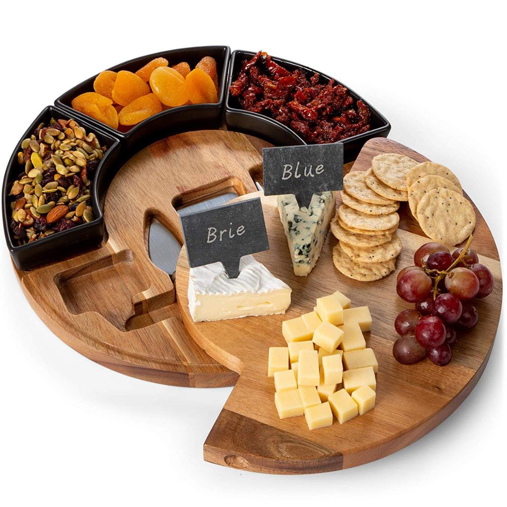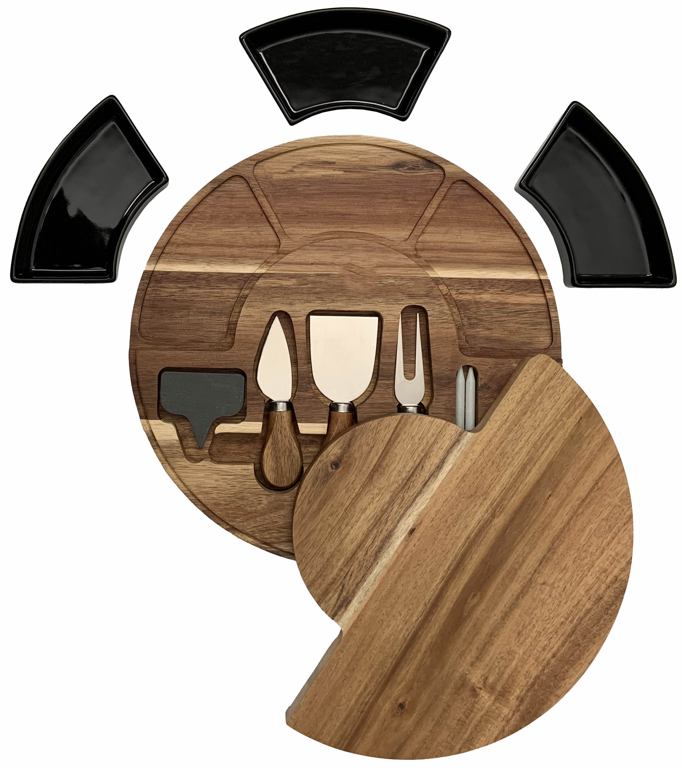 Set 9 piese pentru servire util in fiecare bucatarie. Setul contine 3 boluri din ceramica, 5 ustensite si suportul pe care se pot taia diferite alimente.