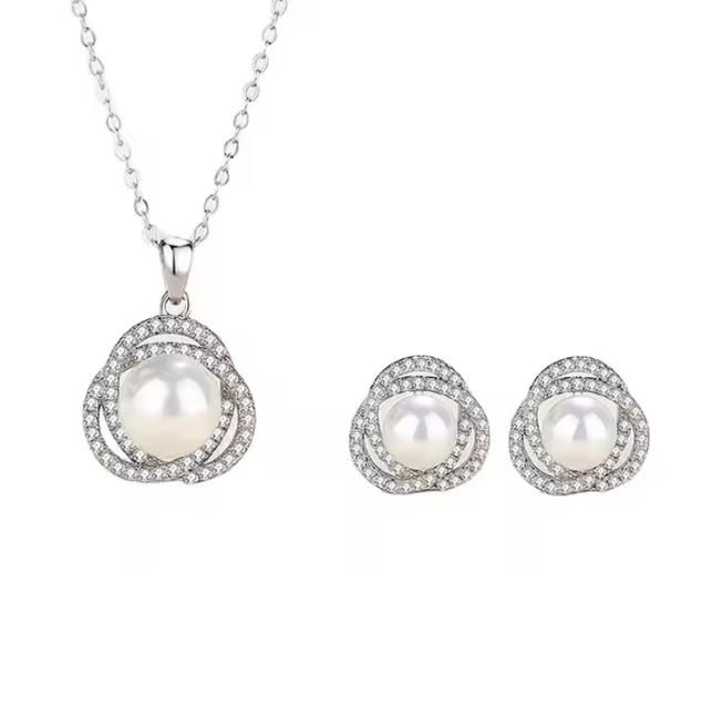 Perluta centrală, înconjurată de rânduri subtile de zirconiu strălucitor, conferă setului un farmec aparte, captând privirile și reflectând lumina într-un mod subtil și atrăgător. Cerceii asortați, completează perfect setul, adăugând o notă de eleganță și stil.