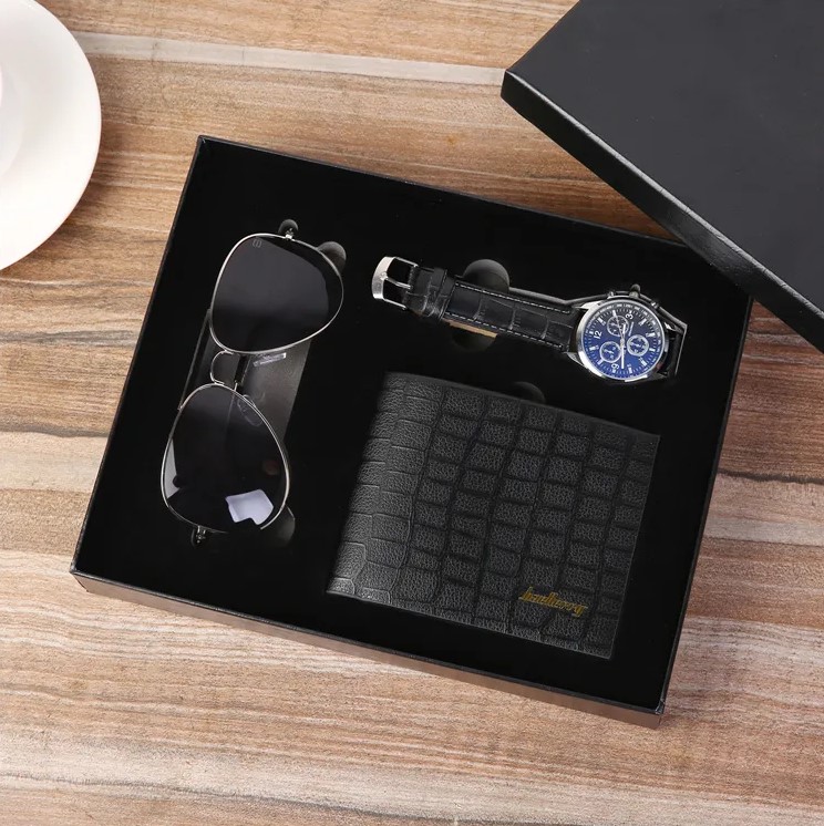 Setul barbatesc portofel negru, ceas si ochelari de soare este un cadou multifunctional, care nu ar trebui sa lipseasca din colectia personala.