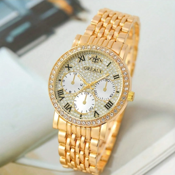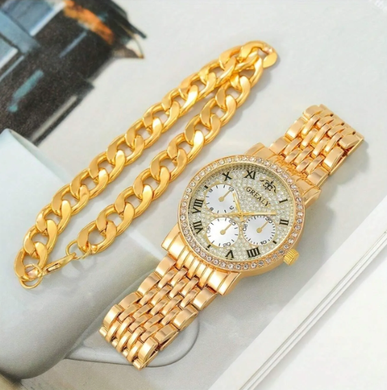 Setul ceas auriu si bratara metalica denota o eleganta aparte atunci cand este purtat. Bratara placata cu aur completeaza perfect tinuta.