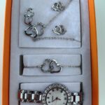 Setul pentru dama este format din ceas, bratara, inel, colier si cercei asortati. Ceasul are un cadran de dimensiuni potrivite, cu un design elegant și rafinat. Brățara ceasului este prevăzută cu cristale care îi conferă o notă de eleganță și strălucire. Bratara din set este din oțel inoxidabil, ceea ce îi conferă o durabilitate și strălucire deosebită.