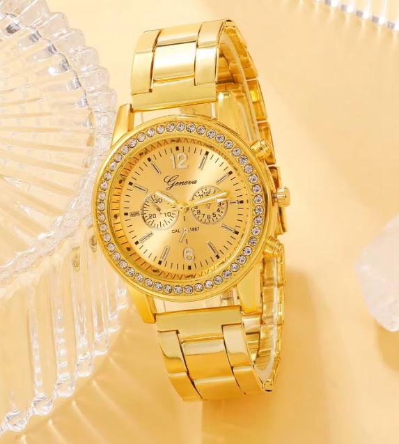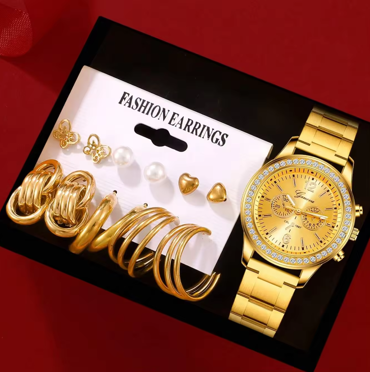Setul ceas dama Geneva cu cercei este compus dintr-un ceas și șase perechi de cercei, cu un luciu strălucitor și finisaje atent lucrate. Ceasul are un cadran elegant, decorat cu cristale, iar bratara acestuia este metalica.