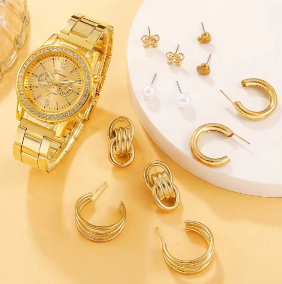 Această combinație de ceas și cercei aurii pentru damă este perfectă pentru a completa orice ținută și pentru a adăuga un strop de strălucire și eleganță în orice ocazie, fie că este vorba despre o întâlnire în oraș, o petrecere sau chiar o zi obișnuită la birou. Este un set care îmbină stilul clasic cu eleganța modernă, și care nu va trece neobservat.