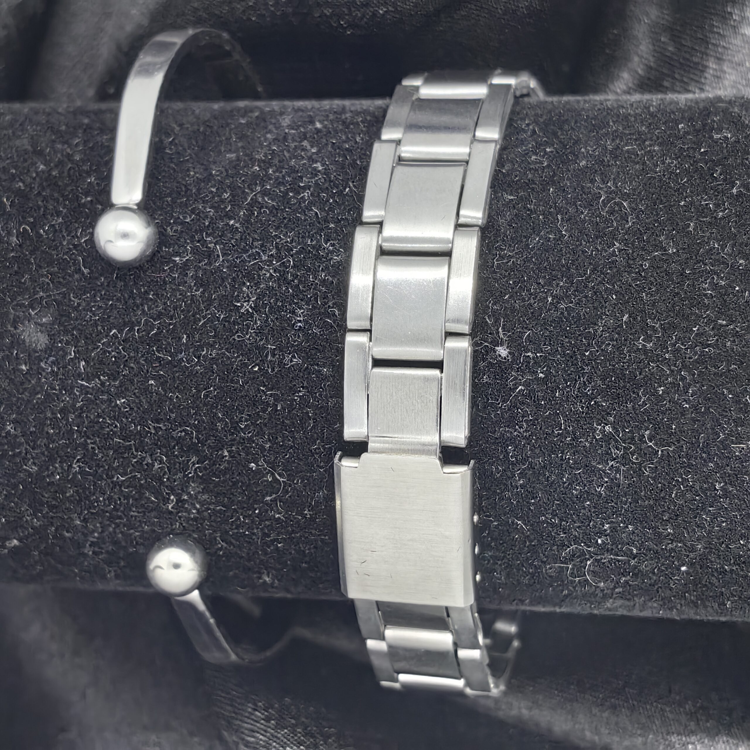 Ceasul are un cadrul argintiu, care conferă o notă de puritate și eleganță. Brățara are un design rigid care se potriveste cu ceasul și adaugă un strop de strălucire și eleganță.