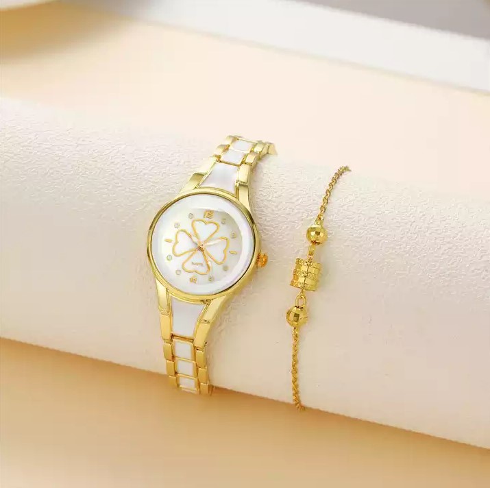 Acest set format dintr-un ceas auriu cu alb în interiorul cadranului, având o floare, și o brățară din aliaj placat cu aur cu un model deosebit, este alegerea perfectă pentru a aduce o notă de rafinament și feminitate în accesorizarea ta. Cu detalii elegante și un design bine conturat, acest set poate fi purtat cu încredere pentru a atrage priviri admirative în orice ocazie.