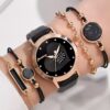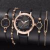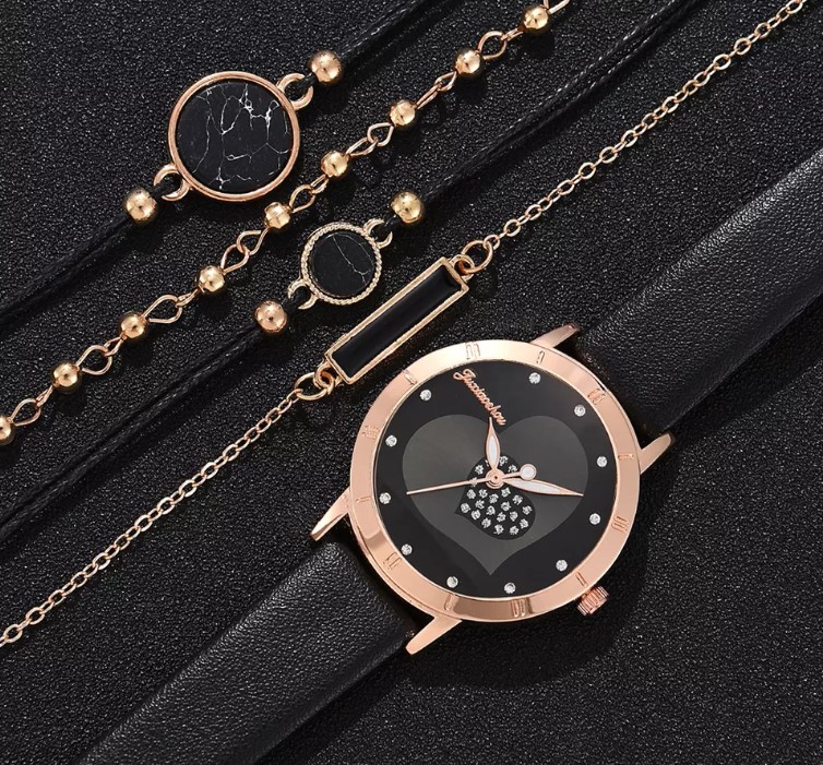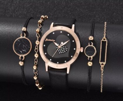 Acest set format dintr-un ceas negru și patru bratari placate cu aur și detalii negre este alegerea perfecta pentru cei care doresc sa aduca un plus de stil si eleganta in accesorizarea lor. Cu detalii atent alese si un design deosebit, acest set poate fi purtat cu încredere pentru a atrage priviri admirative în orice ocazie.