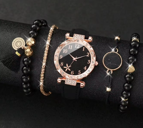 Acest set format dintr-un ceas negru și patru brățări din aliaj placat cu aur și șnur negru este alegerea perfectă pentru cei care doresc să aducă o notă modernă și versatilă în accesorizarea lor. Cu detalii elegante și un design bine conturat, acest set poate fi purtat cu încredere pentru a completa ținutele într-un mod contemporan.