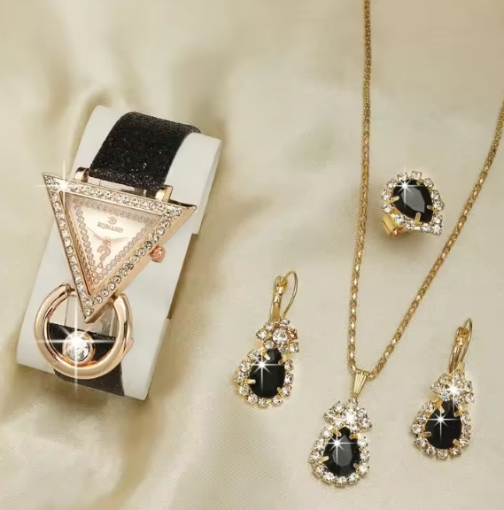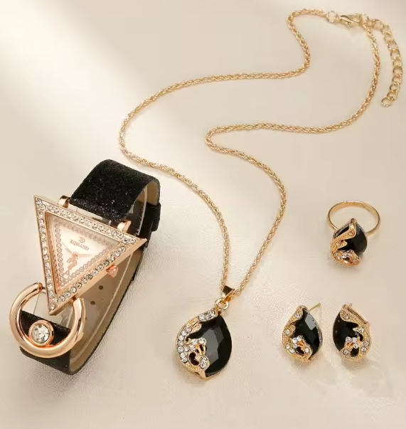 Setul pentru dama este format din ceas, inel, colier si cercei asortati. Ceasul are un cadran de dimensiuni potrivite, cu un design simplu și elegant, însoțit de o brățară de piele ecologică neagra pentru a crea un aspect plin de culoare și stil. Colierul are un pandantiv frumos, care poate adăuga o notă de eleganță ținutei voastre.
