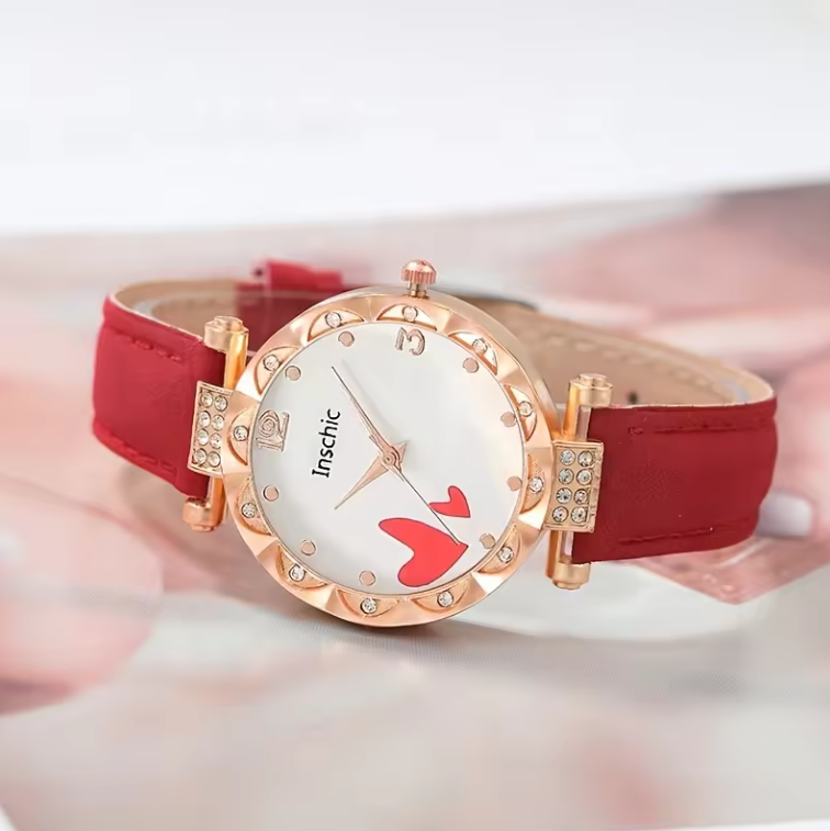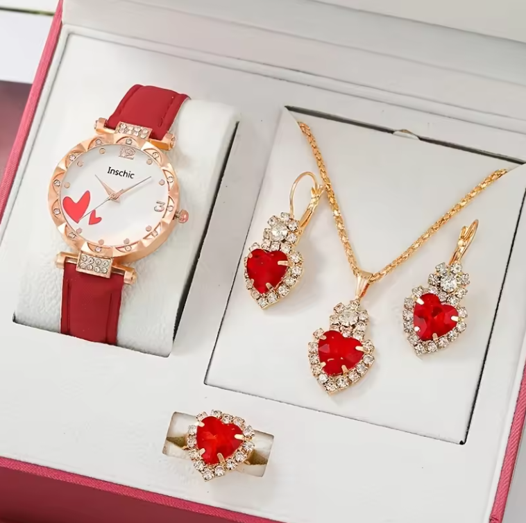 Setul pentru dama este format din ceas, inel, colier si cercei asortati. Ceasul are un cadran de dimensiuni potrivite, cu un design simplu și elegant, însoțit de o brățară de piele ecologică roșie pentru a crea un aspect plin de culoare și stil. Colierul are un pandantiv frumos, care poate adăuga o notă de eleganță ținutei voastre.