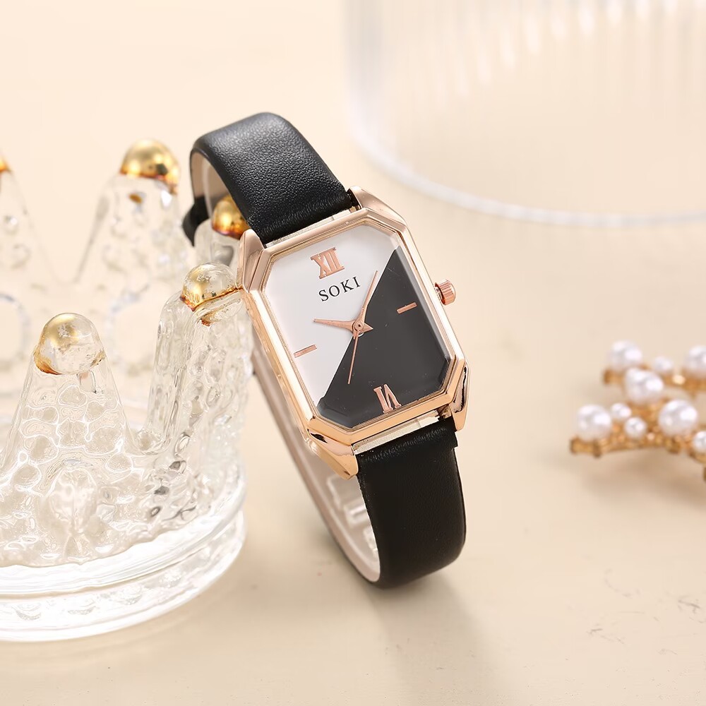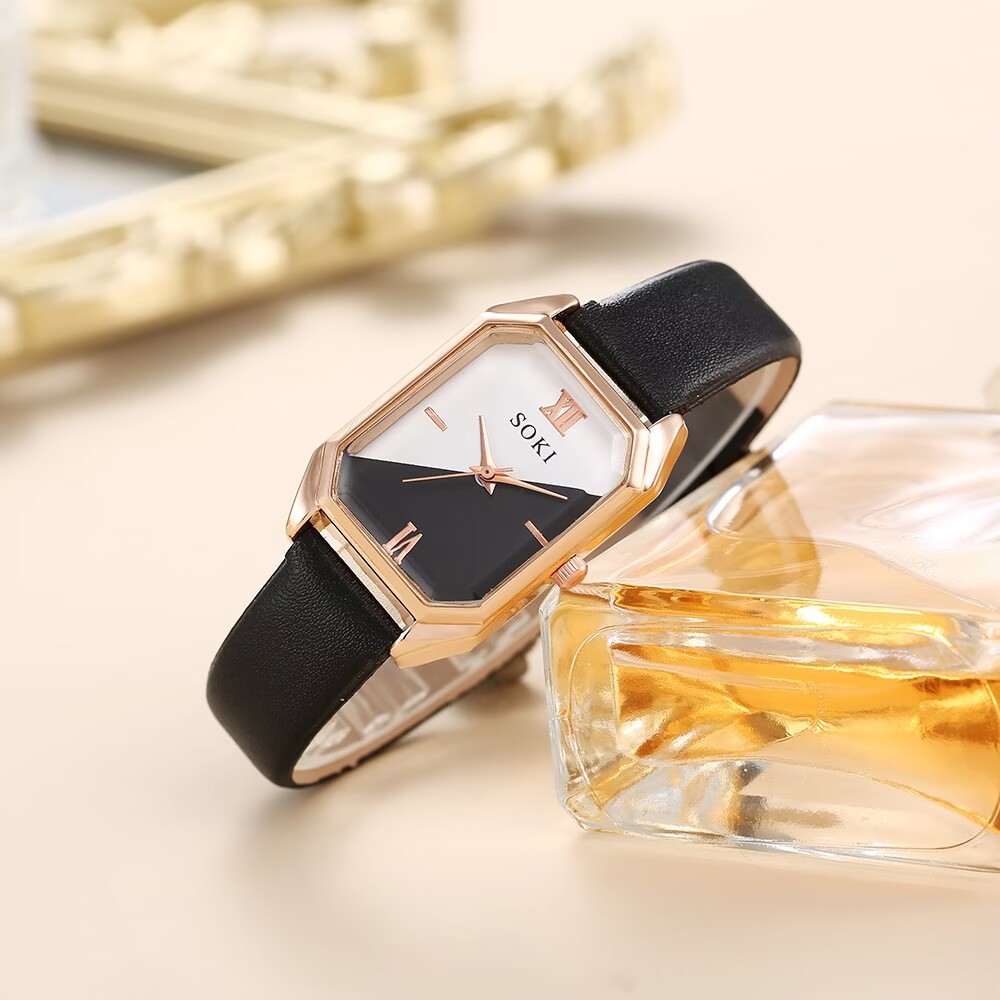 Setul pentru dama este format dintr-un ceas negru cu detalii aurii si bratari elegante. Ceasul are un cadran de dimensiuni moderate, cu detalii aurii, care adaugă un element de strălucire și eleganță. Brățările elegante sunt variate ca lungime și sunt fabricate din aliaj placat cu aur 18k, împreună cu elemente din sfoară, adăugând o notă de lux și strălucire setului.