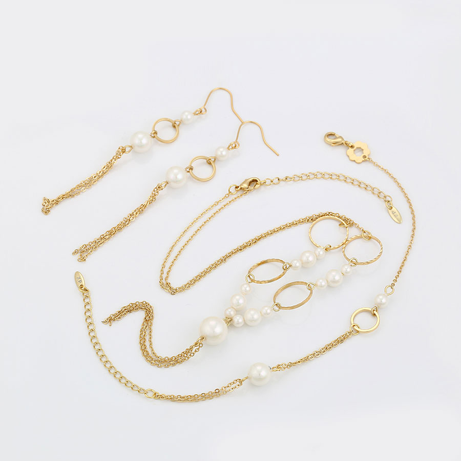 Setul colier bratara si cercei perlute placat aur este un ansamblu elegant și strălucitor, conceput pentru a adăuga o notă de lux și rafinament oricărei ținute. Fiecare piesă din set este confecționată din aliaje comune, care este ulterior placat cu un strat subțire de aur, obținându-se astfel un aspect strălucitor și sofisticat.