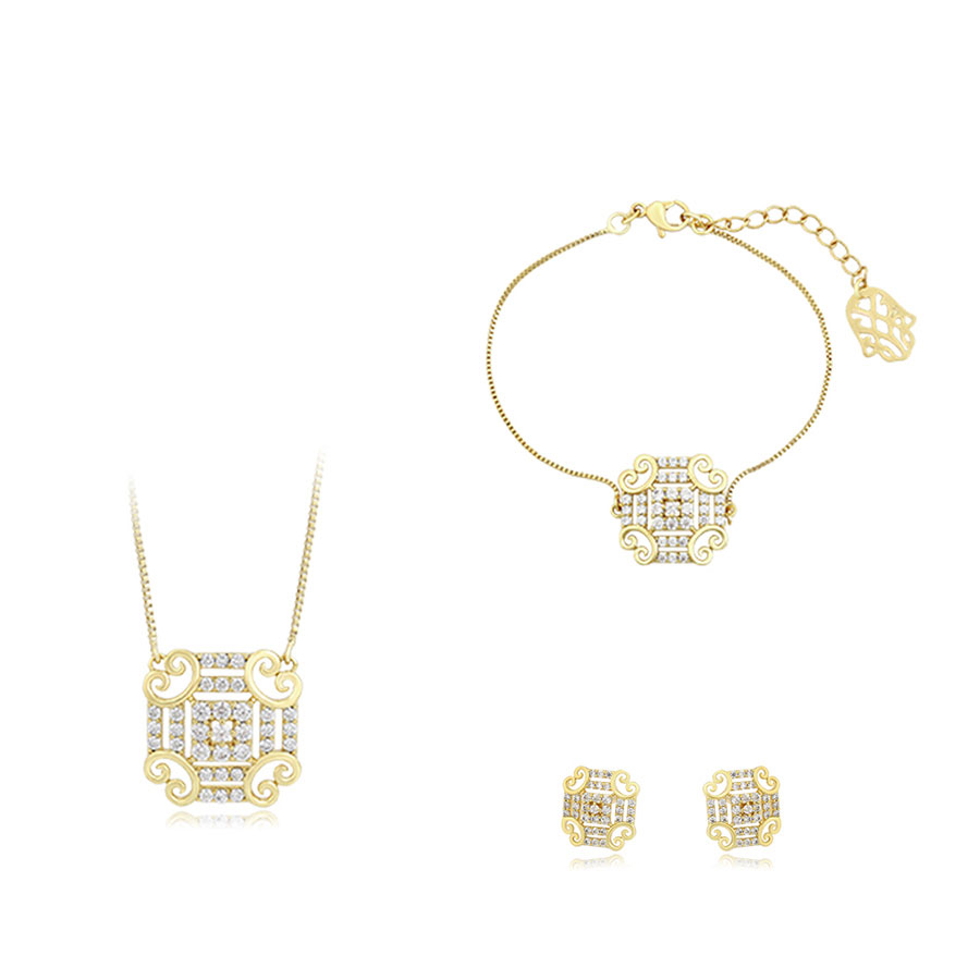 Aurul placat care acoperă fiecare componentă a acestui set conferă o aură de lux și eleganță. Cristalele adaugă strălucire, iar designul detaliat al fiecărei bijuterii contribuie la aspectul sofisticat.