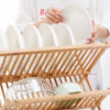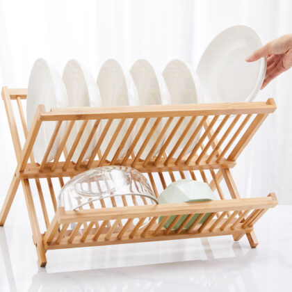 Suportul vase din bambus va ajuta sa uscati vasele si sa economisiti spatiu in bucatarie. Realizat din bambus, un lemn foarte rezistent la umezeala, este prevazut cu raft superior pentru farfurii si vesela mare si un raft inferior pentru pahare sau cani.