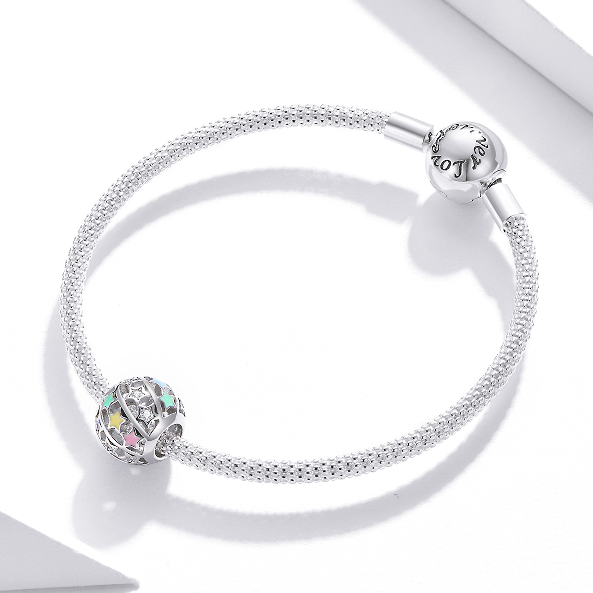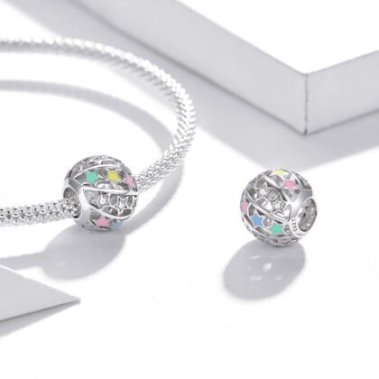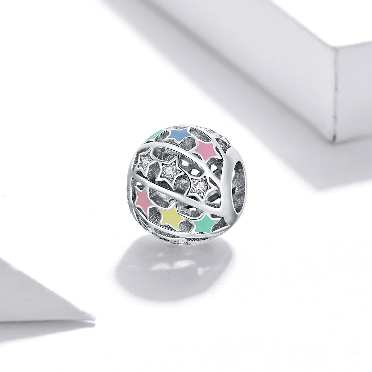 Talismanul argint 925 Colorfull stars are forma unei sfere, în care se află un univers de stele colorate. Realizat cu atenție, pandantivul atrage privirea cu strălucirea sa și culorile vibrante. Fiecare stea de pe pandantiv este realizată cu grijă, iar culorile strălucitoare adaugă complexitate și strălucire bijuteriei. Detaliile fine evidențiază frumusețea sa.
